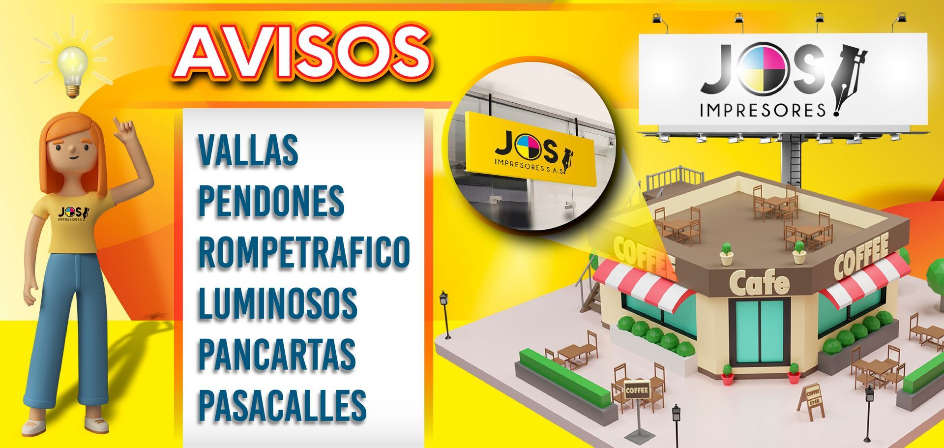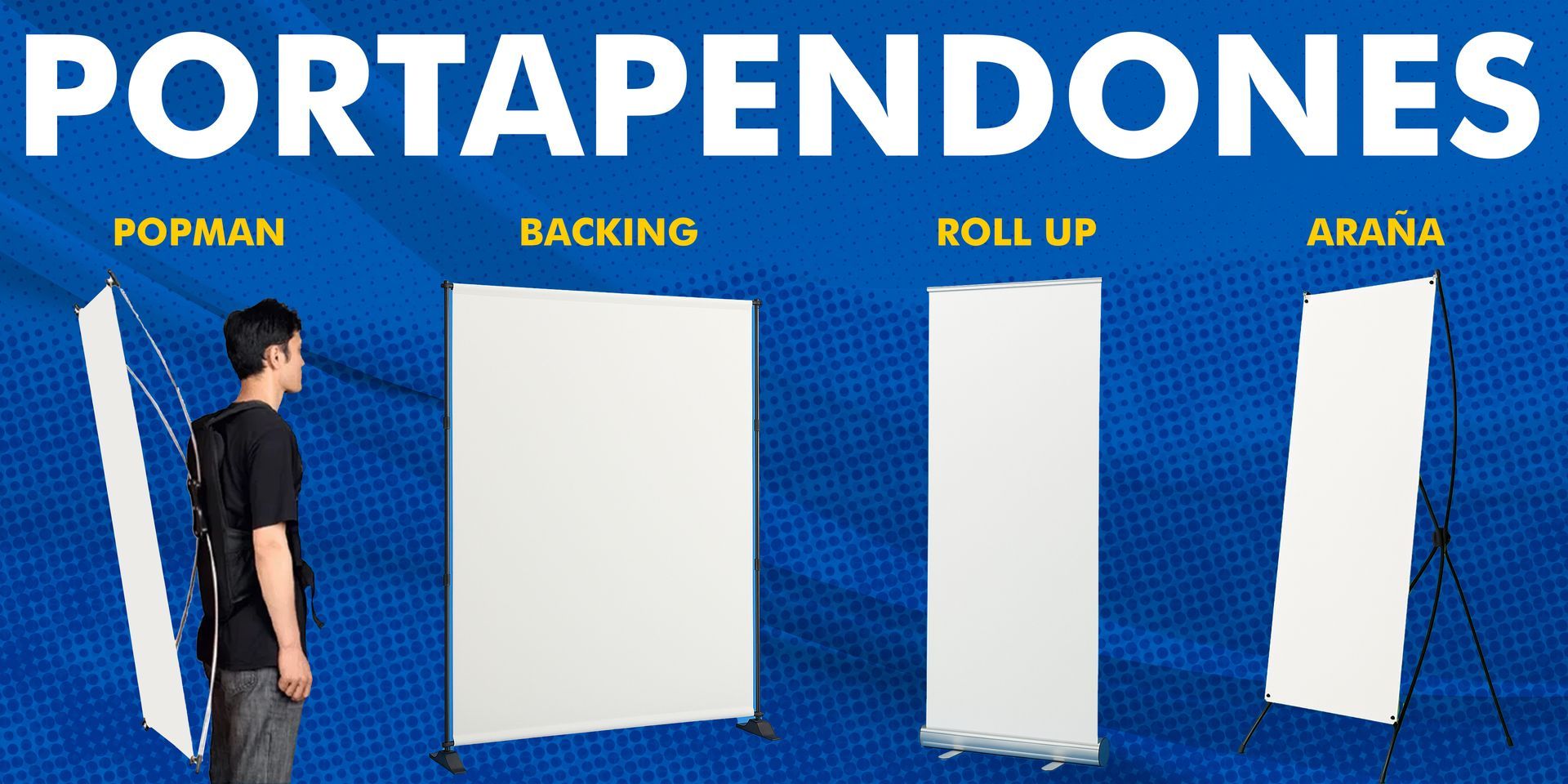 Cajas de luz, Bastidores, Esquineros, Rompe tráficos, Habladores, Roll ups, Arañas, Señalización, Aviso 3D, Backing, Counter.
